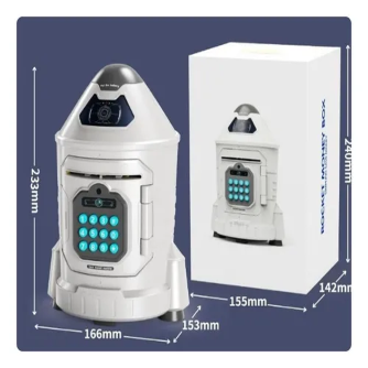 Alcancía Electrónica Traga Billetes Caja Fuerte CoheteRegalo ideal para niños, la alcancía en forma de cohete es una delicia para los niños amantes del espacio. Es perfecto para cumpleaños, Navidad, Día del Niño y cualquier otra fiesta o evento temático espacial.Reconocimiento facial simulado: esta caja fuerte para niños cuenta con protección con contraseña y reconocimiento facial simulado para desbloquear. Simplemente ingrese su código de 3 dígitos y acérquese a la luz azul parpadeante para abrir la puerta.Pergamino automático de papel monedero: cuando se utiliza esta caja de ahorro de dinero, los billetes se enrollan automáticamente a través de la ranura para billetes, y las monedas se pueden colocar en la ranura superior para monedas. Para un fácil acceso a depósitos más grandes de efectivo, monedas, juguetes pequeños o cualquier otro artículo preciado, los niños también pueden desbloquear la alcancía de juguete directamente.Juguetes educativos para niños: estos bancos de dinero electrónico no son solo juguetes, sino herramientas valiosas que combinan diversión y aprendizaje, ayudando a los niños a embarcarse en un viaje hacia la educación financiera y la responsabilidad. Al ahorrar para objetivos y ver crecer sus ahorros, los niños pueden desarrollar hábitos financieros positivos.Materiales de alta calidad: hechos de plástico ABS de alta calidad, nuestros bancos para niños son resistentes y confiables para el uso diario. Son una adición duradera a la habitación de cualquier niño, lo que refleja nuestro compromiso con la calidad y la seguridad infantil