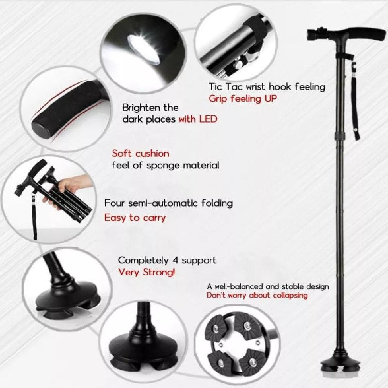 Baston Ortopedico Plegable Ajustable Con Linterna Diseñado para brindar apoyo y confianza al caminar, el bastón ortopédico con linterna es la combinación perfecta entre funcionalidad, comodidad y seguridad. Ideal para personas mayores, en rehabilitación o con movilidad reducida, este bastón ofrece soporte firme en cualquier entorno, incluso en condiciones de poca luz. Características: - Altura ajustable: Se adapta a diferentes estaturas con un sistema de ajuste fácil y seguro, ofreciendo la postura correcta. - Diseño plegable: Se pliega de forma compacta para facilitar su transporte y almacenamiento. Cabe en bolsos, mochilas o compartimentos pequeños. - Linterna LED integrada: Incluye una práctica luz frontal que mejora la visibilidad en lugares oscuros, escaleras, pasillos o al aire libre durante la noche. - Empuñadura ergonómica: Mango cómodo y antideslizante, diseñado para un agarre seguro.