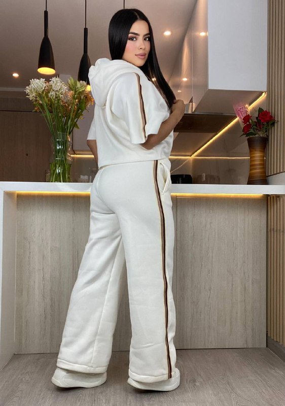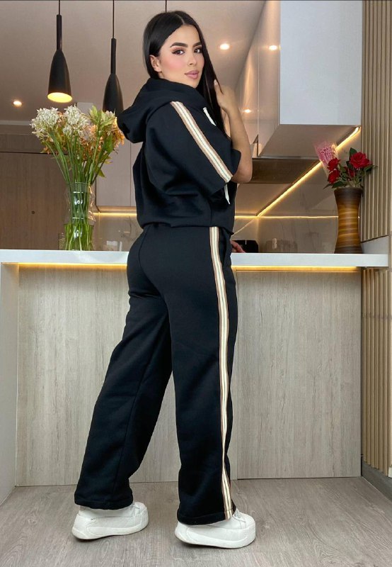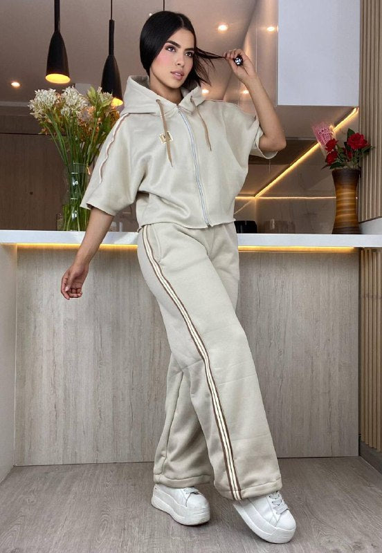 Diseño Moderno: Conjunto de dos piezas con sudadera de capucha y detalles contrastantes en las mangas y piernas que estilizan la figura.