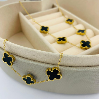 Este collar está diseñado exclusivamente con Material de Rodio, un metal que se distingue por su acabado brillante y su apariencia similar al oro blanco o al platino. Las aplicaciones del trébol son de color negro, creando un contraste elegante y llamativo con la cadena metálica. A diferencia de muchos accesorios de bisutería, este collar es hipoalergénico, lo que minimiza el riesgo de irritación en pieles sensibles.