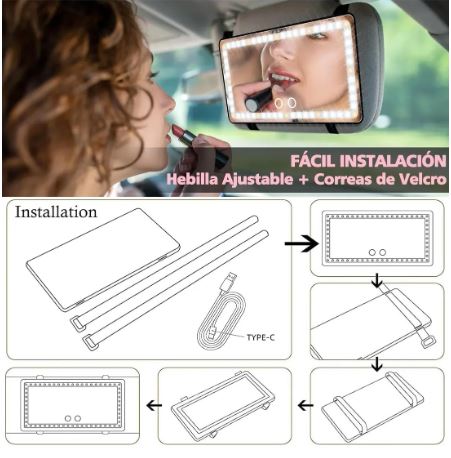 El Espejo Luminoso para auto ofrece una iluminación perfecta para maquillarte o retocarte en cualquier momento del día. Su sistema de luces LED distribuye la claridad de manera uniforme, evitando sombras molestas. Se instala fácilmente en el parasol gracias a sus clips ajustables que garantizan firmeza y seguridad. Ideal para quienes buscan mantener una imagen impecable durante el viaje, ya que combina diseño moderno, buena visibilidad y bajo consumo de energía. Tamaño del paquete: 28 cm de largo x 17 cm de alto x 4 cm de ancho