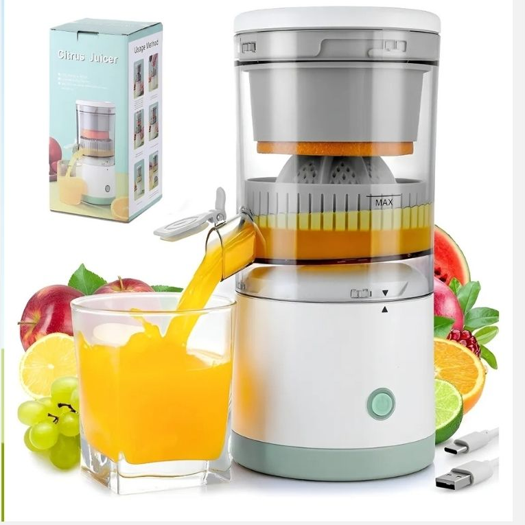 Este producto es un Exprimidor de Naranjas Eléctrico y Extractor de Jugo para Frutas Cítricas. Su diseño inalámbrico permite usarlo en cualquier lugar de la cocina o el hogar sin depender de tomas de corriente. Está diseñado para extraer jugo de diversas frutas cítricas.