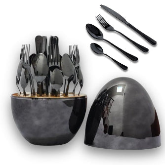 Eleva tus comidas con este elegante juego de cubiertos de 24 piezas, diseñado para combinar estilo y funcionalidad. Ideal para cualquier ocasión. Características: -Composición Completa: El juego incluye 6 cuchillos, 6 tenedores, 6 cucharas y 6 cucharaditas tinteras, todos fabricados en acero inoxidable, con un elegante acabado en color Negro. -Diseño Sofisticado: Presentado en un estuche en forma de huevo, este juego de cubiertos destaca por su diseño minimalista y moderno, que se adapta a cualquier estilo de vajilla. -Material de Alta Calidad: Fabricado en acero inoxidable 410 de grado alimenticio, este conjunto no solo es resistente y duradero, sino también seguro para el contacto con alimentos.