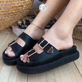 Estas sandalias tipo slide o chinela combinan la moda casual con un toque de elegancia urbana. Presentan una plataforma gruesa (chunky) que proporciona altura sin sacrificar la comodidad al caminar. El diseño de la tira es ancho, cubriendo la parte frontal del pie para una sujeción segura