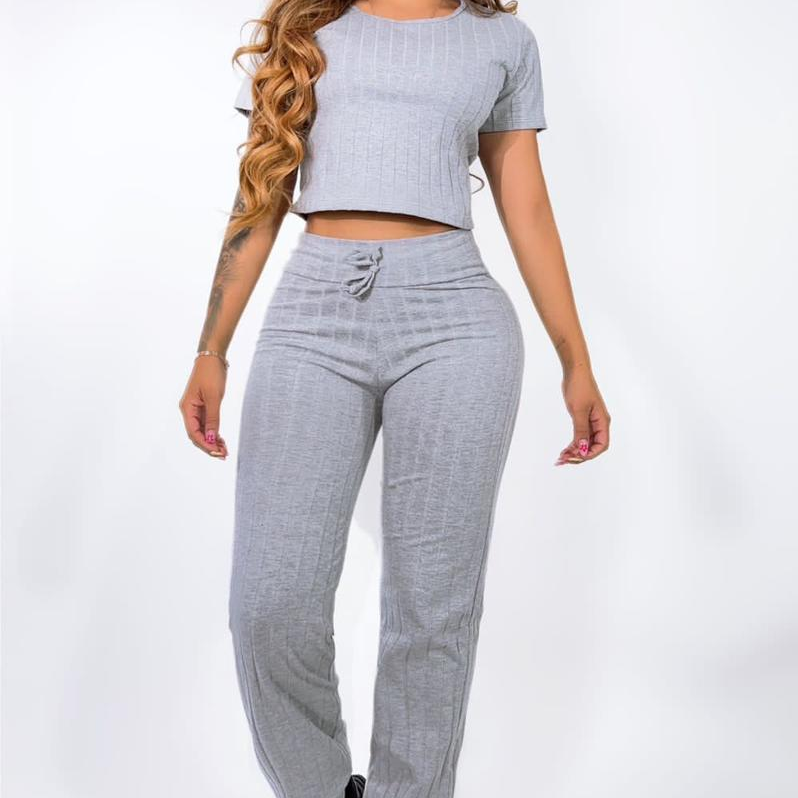 Conjunto de Dos Piezas: Incluye un crop top de manga corta y un pantalón largo de corte recto o ligeramente holgado.